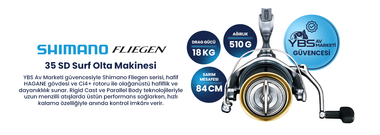 Göz alıcı tasarımıyla öne çıkan Shimano Fliegen 35 SD, örgü misina ile yapılan surf ve sazan balıkçılığı için geliştirilmiş, birinci sınıf uzun mesafe makinesidir. Dünya genelindeki turnuvalarda favori konumda olan bu model, en yeni uzun menzilli teknolojilerle donatılmış olup hem performansıyla hem de estetik tarzıyla dikkatleri üzerine çeker.
