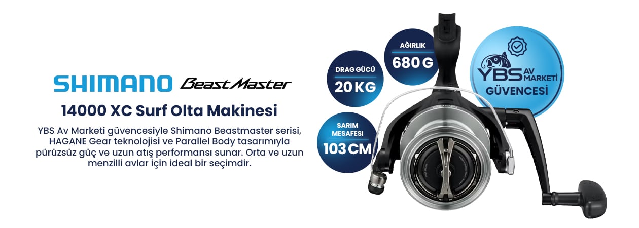 Shimano Beastmaster 14000 XC Surf, uygun fiyatı, sağlam yapısı ve ileri Shimano teknolojileriyle uzun menzilli balıkçılıkta güvenilir bir yol arkadaşınızdır.